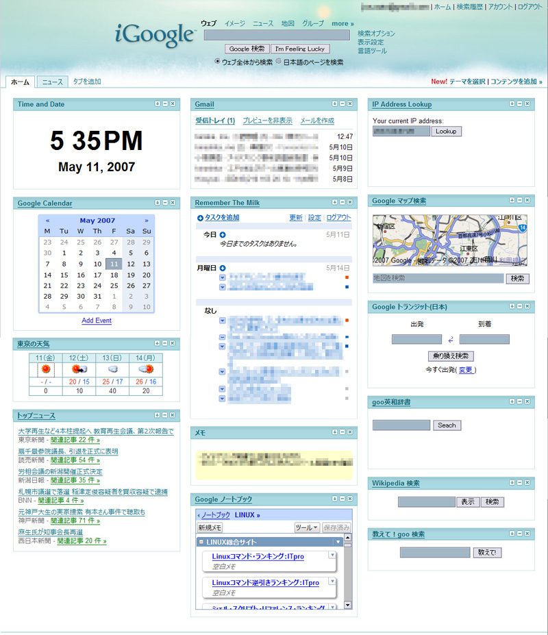 でも、gmailとRemember The Milkとgoogleノートブックと天気が一覧できるところがもうなにより素敵なわけで、googleカレンダーのスケジュール月間予定が出せるようになってgoogleノートブックのサイズ設定を手動にできればなおのことハッピー。