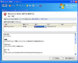 今、私の自宅PCではスパイウェア対策としてSpybot、Ad-Aware(personal)、SpywareBlasterの3つを使っていますが、Windws Difenderはリアルタイムで検知するという部分でspywareblasterとかぶるかな、と思っています。